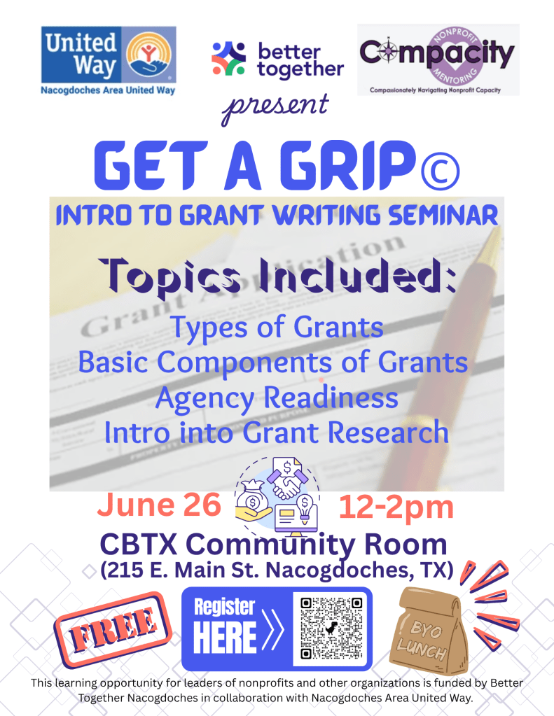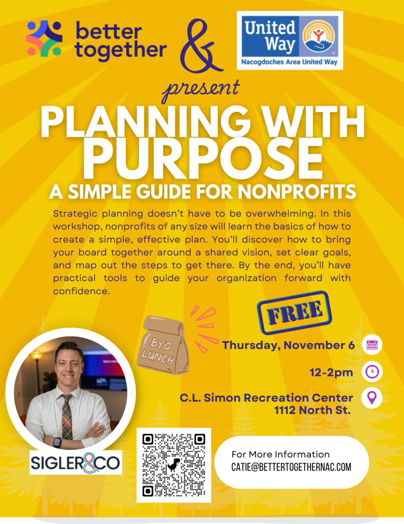 Better Together and Nacogdoches Area United Way are pleased to bring a series of workshops to Nacogdoches County leaders to sharpen their toolkits. We know that there are so many groups doing great work throughout Nacogdoches County, and we want to equip those groups with the skills and resources they need to be able to bring about the greatest possible positive impact for Nacogdoches County residents.