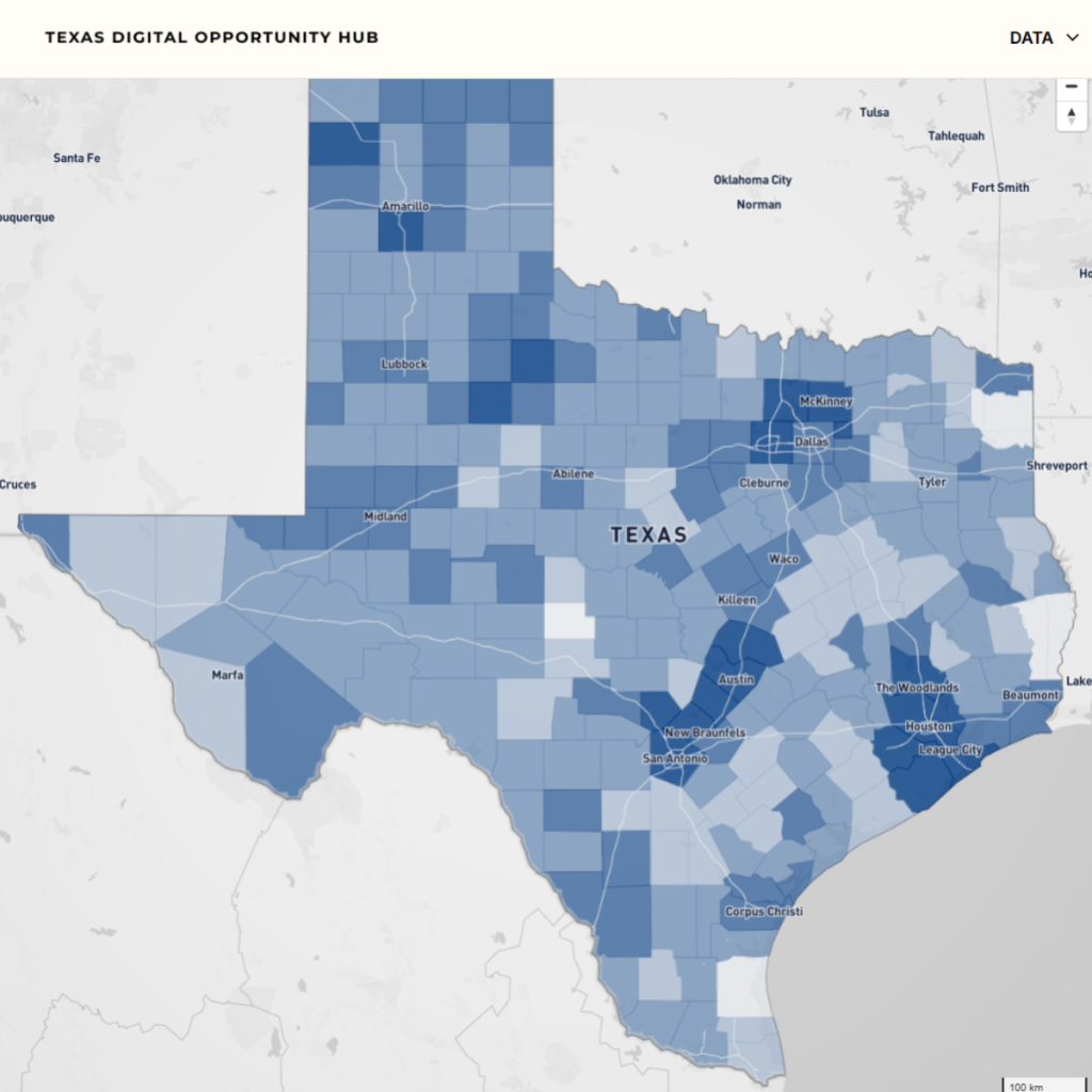 The Broadband Development Office (BDO) has gathered and analyzed data from Texas communities as well as national, public datasets to gain evidence-driven insights into the state of digital opportunity, and to set goals for the next five years and beyond. Explore data related to broadband internet access and usage on this interactive dashboard.