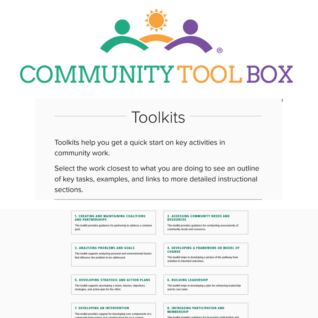 The Community Tool Box is a service of the Center for Community Health and Development at the University of Kansas. These toolkits help you get a quick start on key activities in community work, with links to valuable resources, guides, and other information to support you in your efforts to improve your community!